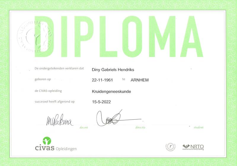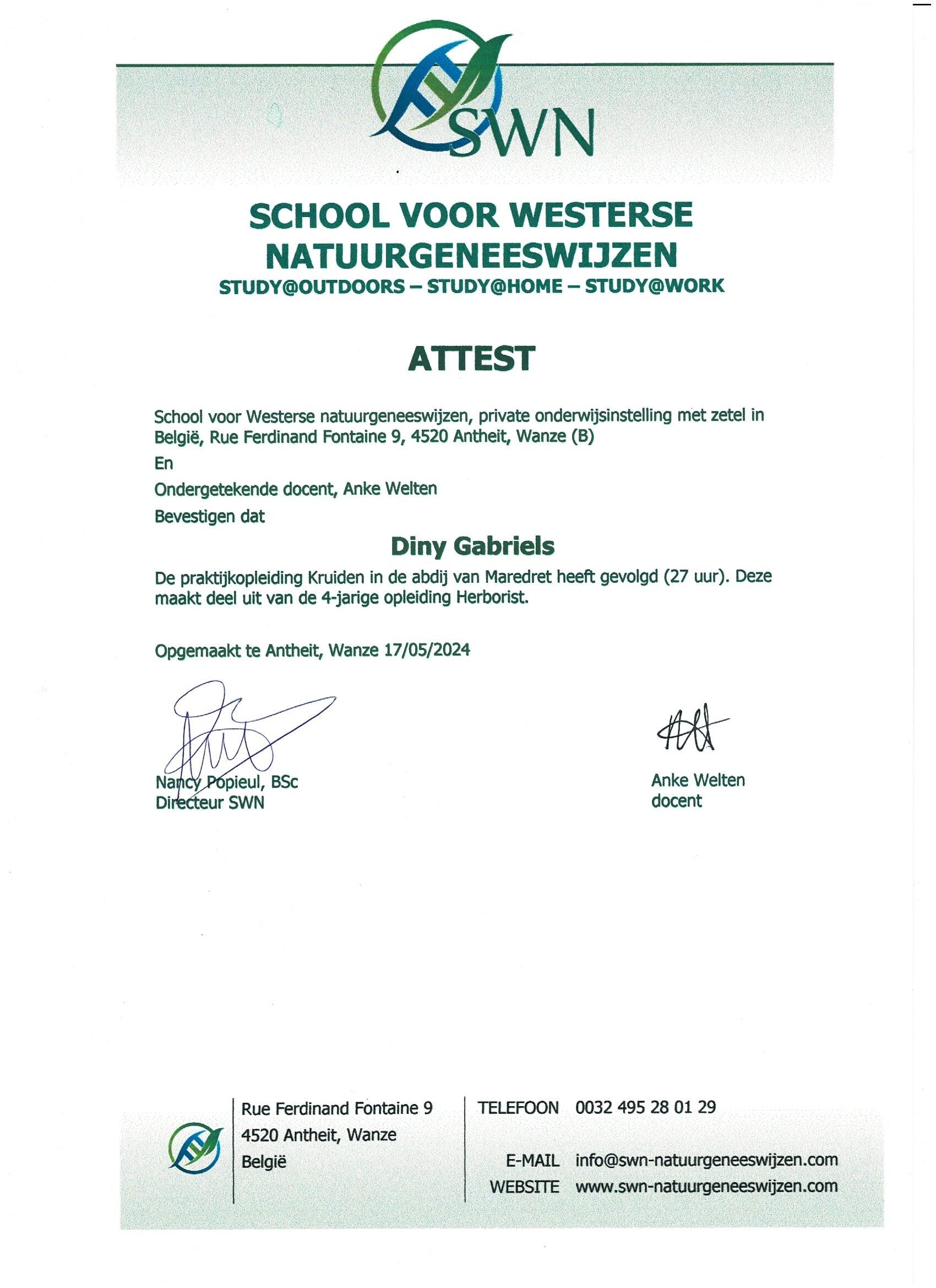 Certificaat : Jaaropleiding Kruidenvrouw / Cursus Kruidenthee Uitgegeven: 2024-08-24 2025-01-07
